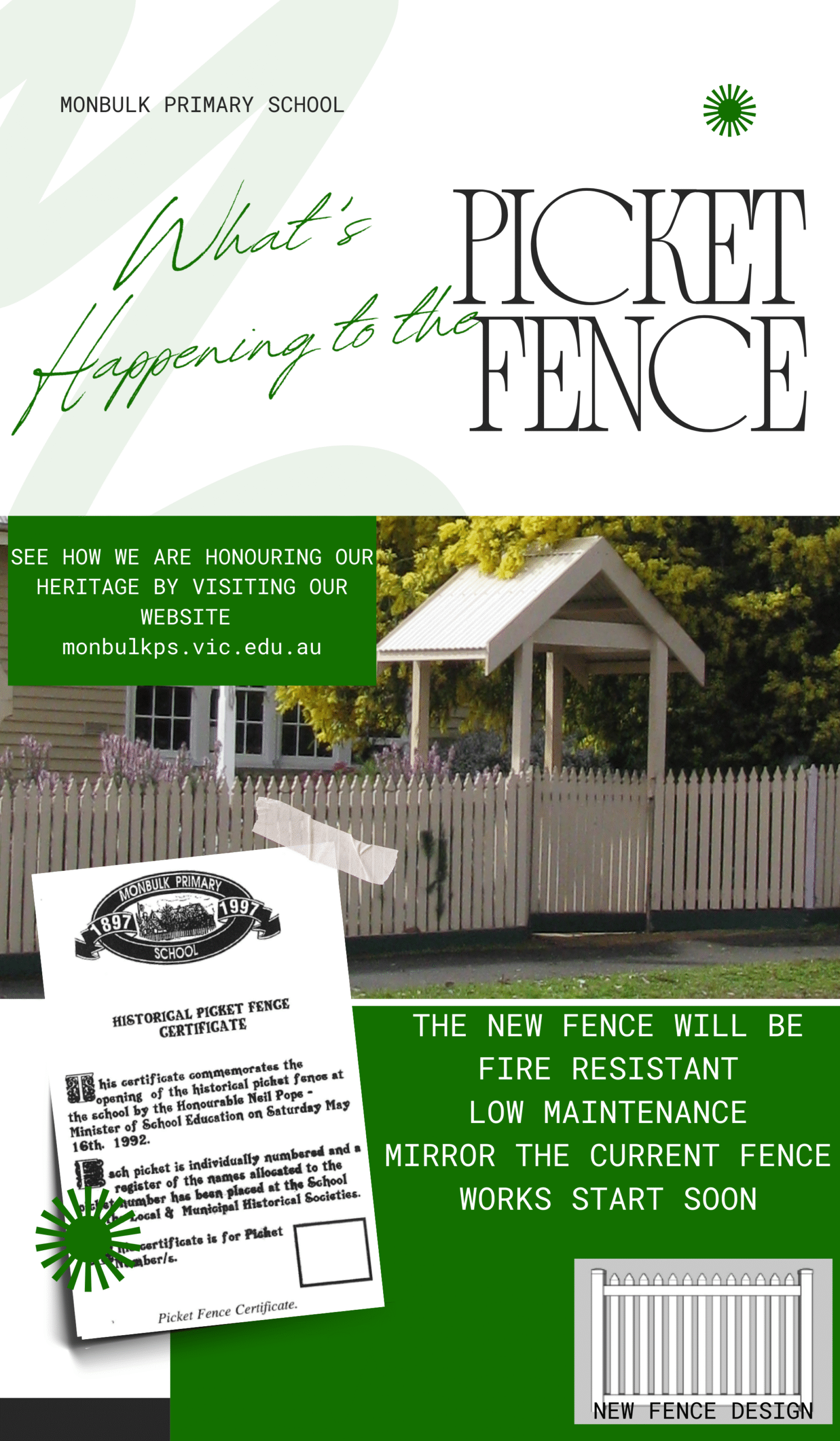 In 1993 a picket fence was constructed by school council, locals and students. Pickets were sold for $2ea and a register kept with each picket numbered. The inspiration for the fence was the original picket fence which was burnt with the school in the bushfires of 1913. Over the years the timbers of the fence have degenerated and now it’s time for a spruce up. Coming in December 2025 and January 2026 the wooden picket fence will be replaced with a fire resistant, low maintenance fence that mirrors the image of the original picket fence. A collection of the numbered pickets will be displayed in the historical school building alongside register of sponsors picket numbers.